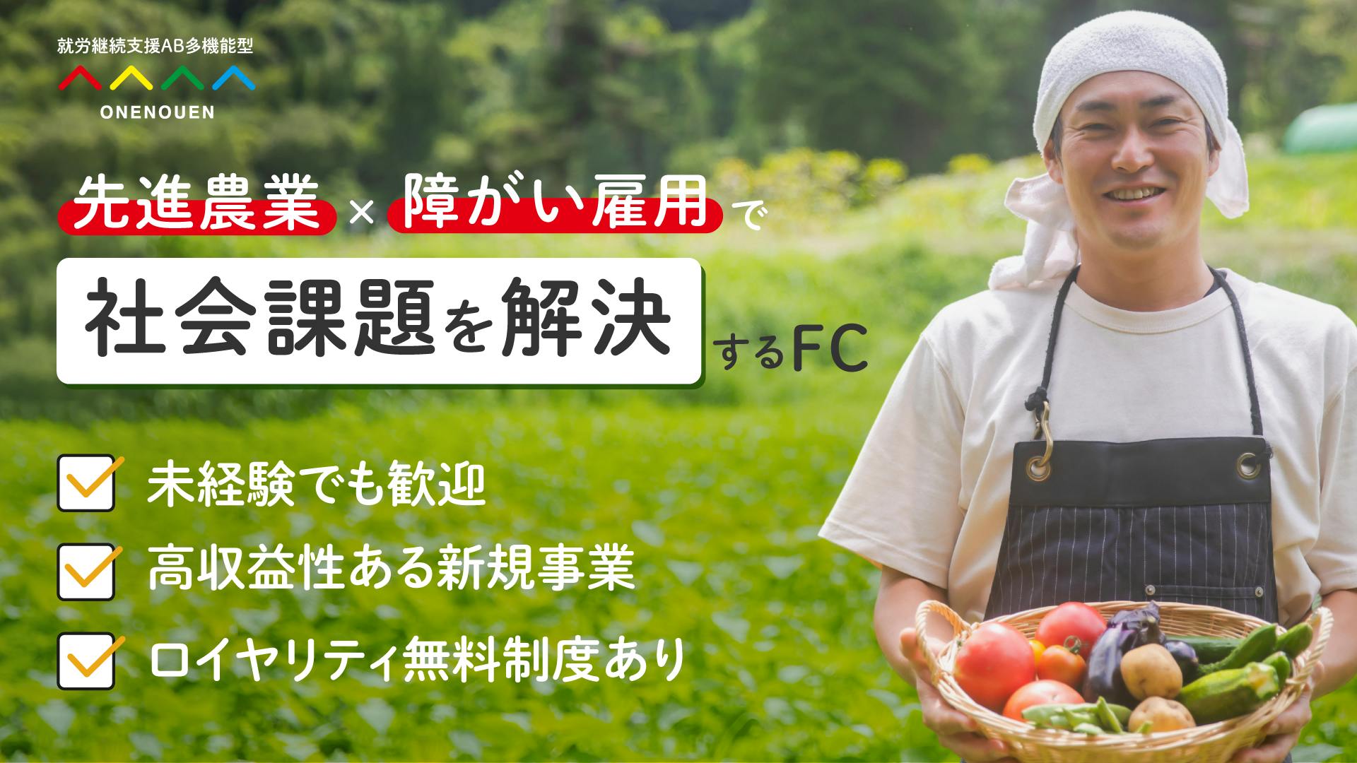障がい者の増加、高齢化による農業の衰退、減り続ける食料自給率、多くの課題が山積している我が国において、企業には社会的な責任が問われています。ONENOUENは、「農業×福祉×企業」の3つの社会課題を積極的に解決するフランチャイズであり持続可能な地域を創出する一つのモデルとなります。